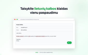 Zodly - Lietuvių gramatikos tikrintuvas является дополнением для Chrome, предназначенным для повышения точности письма на литовском языке на различных онлайн-платформах. Этот инструмент предоставляет автоматические исправления грамматики и орфографии, восстанавливает литовские символы и предлагает варианты перефразирования текста, позволяя пользователям настраивать тон и формат в соответствии с их потребностями. Он совместим с популярными сервисами, такими как Gmail, Facebook и Google Docs, что делает его универсальным для повседневного использования.